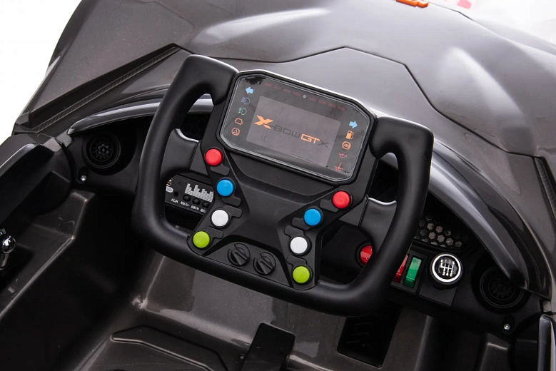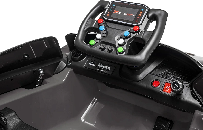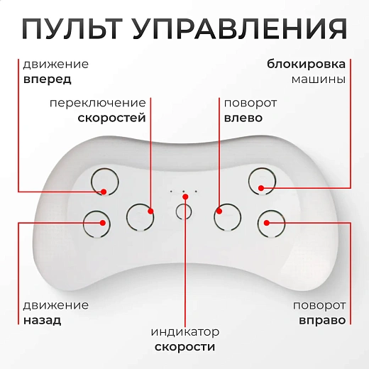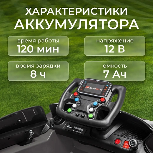 Дистанционное управление позволяет родителям сопровождать поездки. Скорость не превышает 5 км/ч, что обеспечивает безопасность при вождении. Аккумулятор 12 В емкостью 7 Ач заряжается за 8 часов и рассчитан на 120 минут катания.