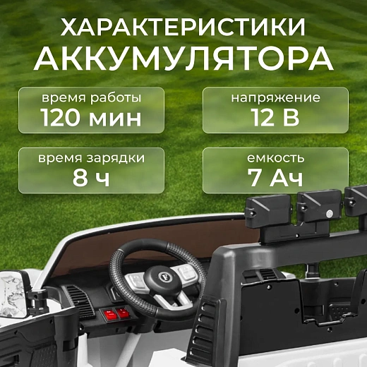 Система дистанционного управления позволяет родителям контролировать движение автомобиля. Аккумулятор 12 В с емкостью 7 Ач заряжается за 8 часов, поддерживая до 120 минут непрерывной работы. Скорость не превышает 5 км/ч для безопасности ребенка.